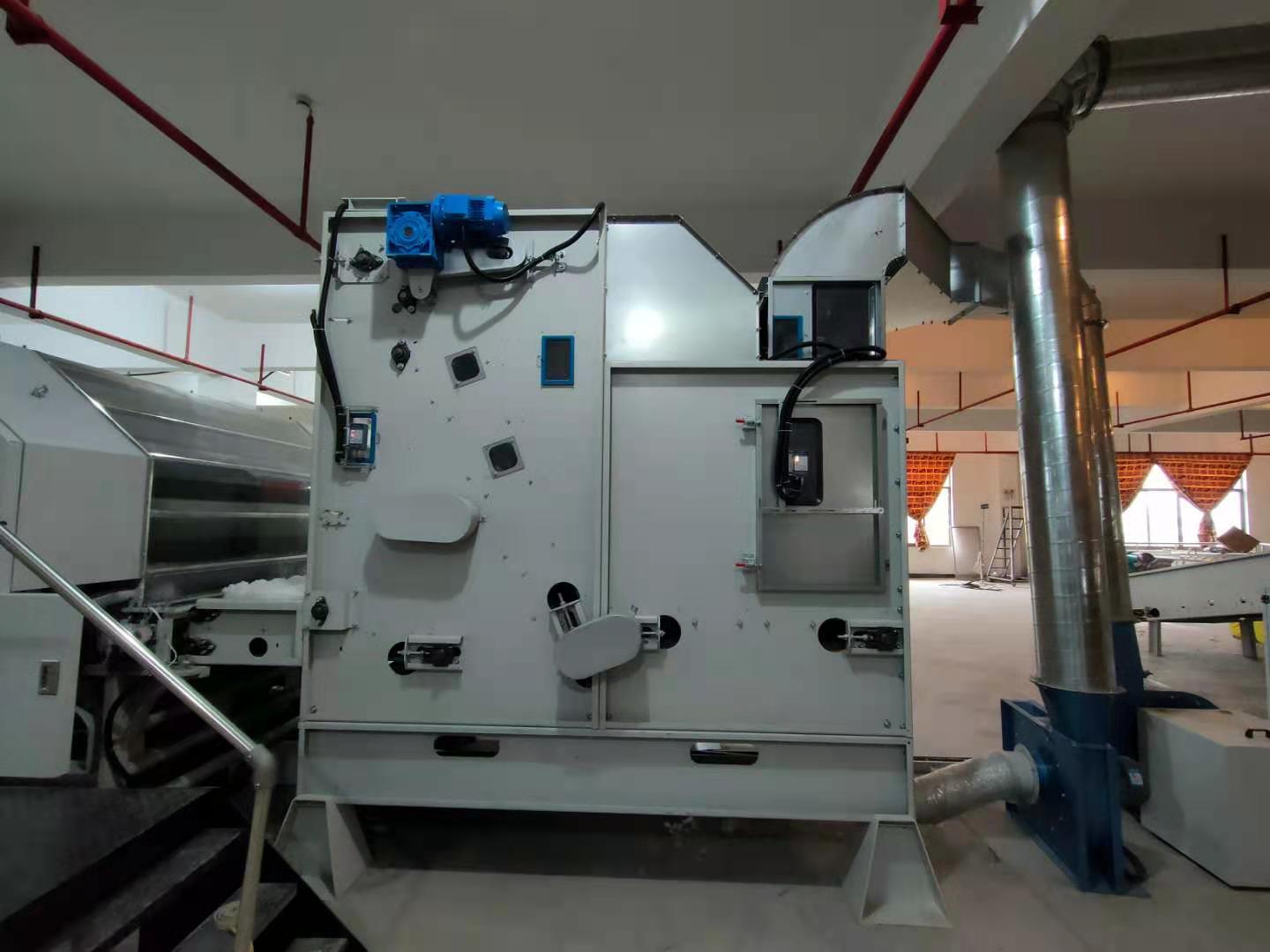 原料開松:將壓縮的化纖塊(如滌綸、PP棉等)通過開松機(jī)打散,形成蓬松狀態(tài)。